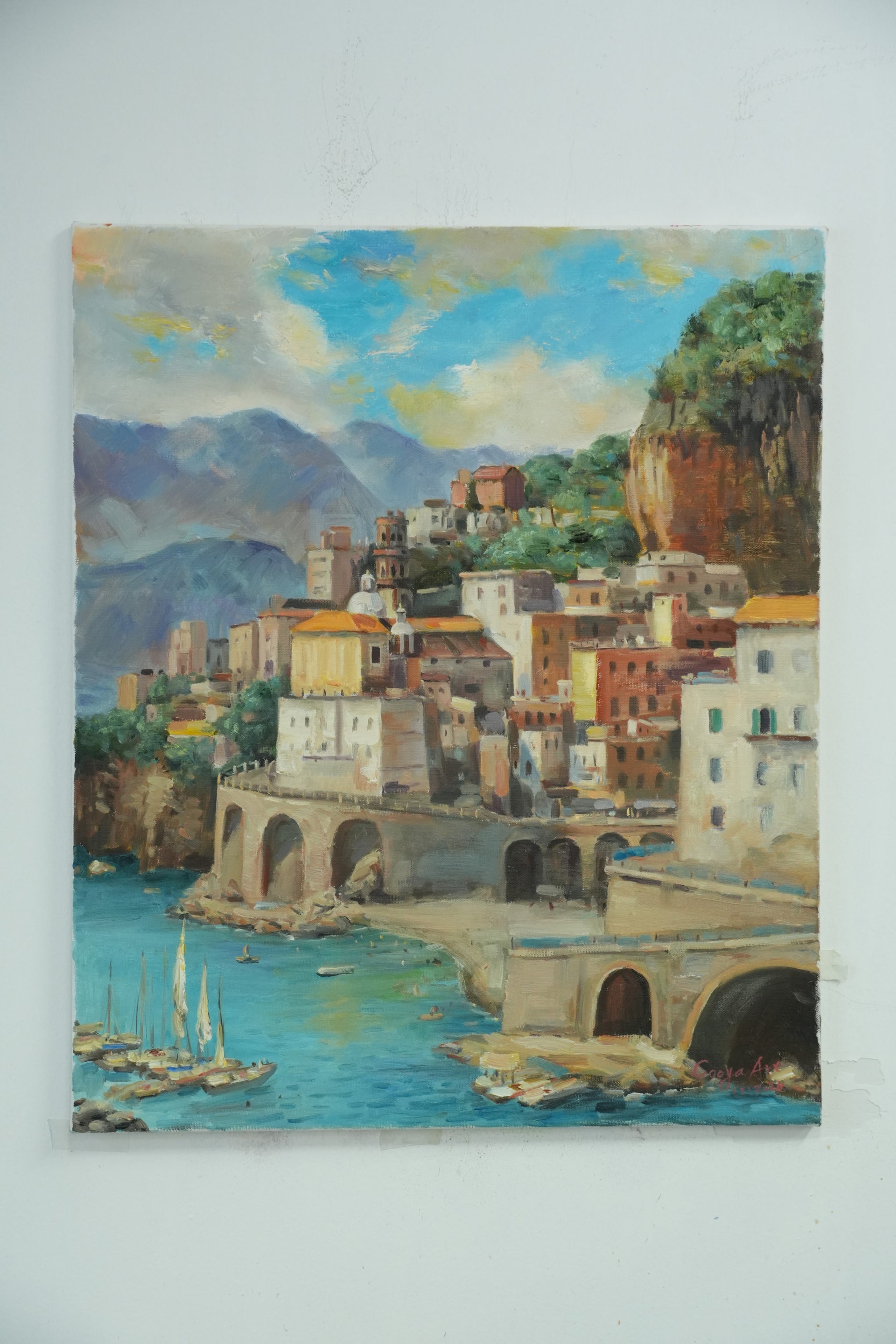 This original oil painting captures the timeless charm and radiant beauty of Italy’s Amalfi Coast. With vibrant seaside houses perched on dramatic cliffs, sunlit skies, and the shimmering blue Mediterranean stretching into the horizon, this piece transports viewers to a peaceful coastal paradise. The rich textures and warm, expressive colors evoke the spirit of Italian summers and the tranquil rhythm of life by the sea.