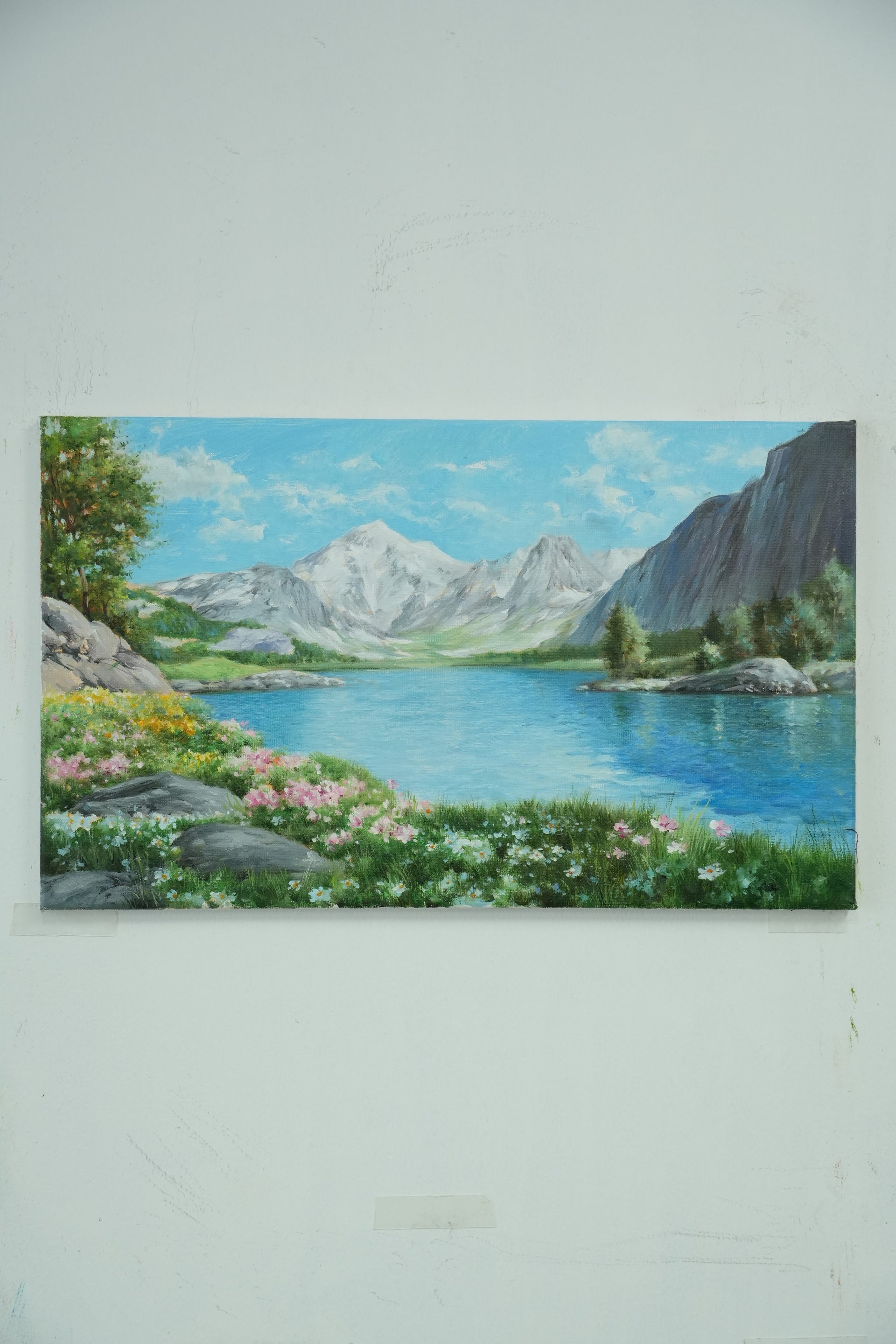 “Mountain Bloom” is a radiant oil painting that captures a breathtaking alpine lake nestled among majestic mountains. The lake's crystal-clear surface mirrors the expansive blue sky and drifting white clouds above, creating a serene blend of earth and sky. Its reflective quality adds a soft blue hue to the water, enhancing the scene's tranquility.