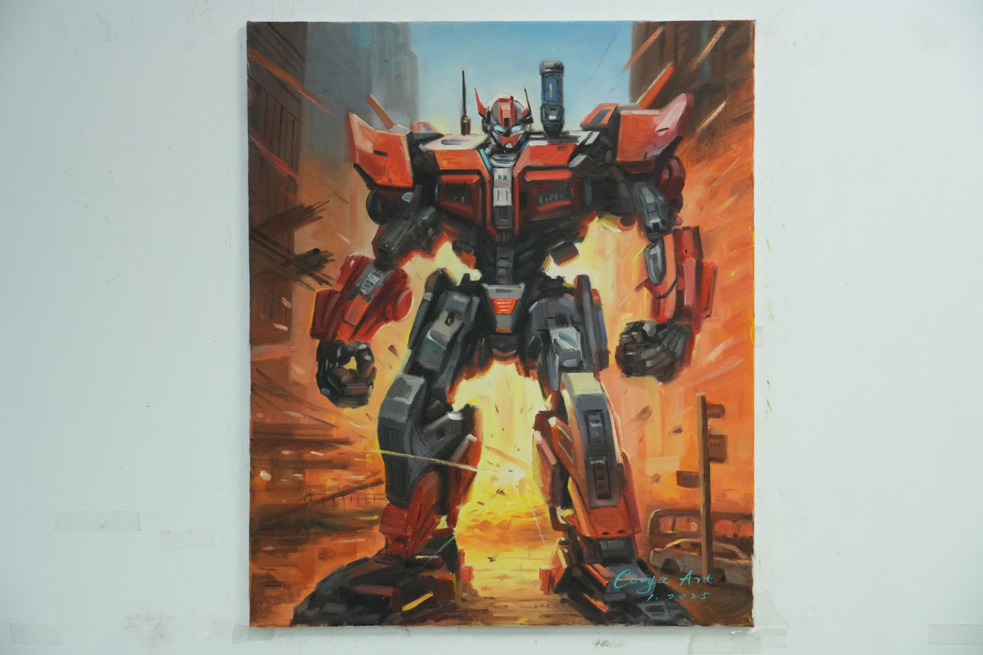 With a bold use of reds, oranges, and metallic tones, this painting fuses raw energy with heroic stillness. The urban destruction contrasts powerfully with the strong stance of the Transformer, symbolizing unwavering duty in the face of chaos.